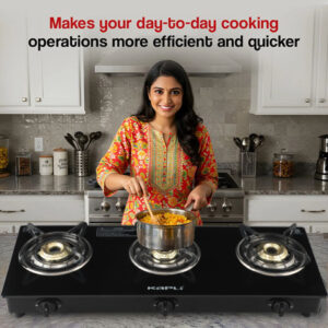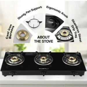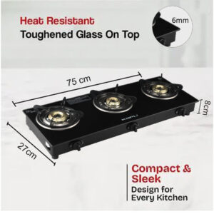 Premium Toughened Glass Top – 6mm thick heat-resistant glass with elegant white finish, 3 High-Performance Burners – Durable cast iron burners for even flame distribution, Strong Pan Support – Supports heavy cookware like pressure cookers & kadai